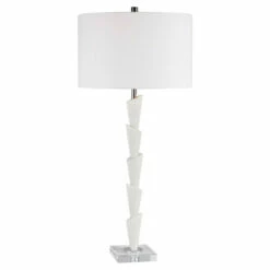 Showcasing a marble look, this table lamp evokes a modern sophisticated style with white and light grey tones that are accented with a thick crystal foot and polished nickel plated details. The lamp is paired with a round hardback drum shade in a white linen fabric.