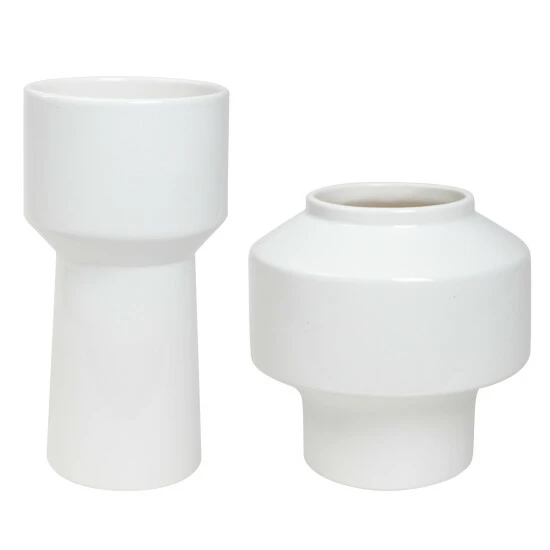Set of two ceramic vessels are finished in a stunning gloss white glaze. The varying vase heights create their own beautiful display or can be used to house floral stems. Sizes: S- 8x8x8, L- 5x10x5