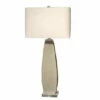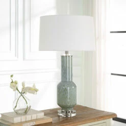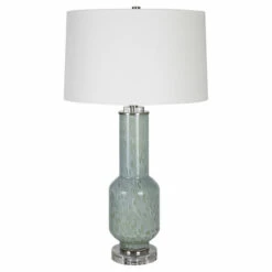 This sophisticated lamp displays a unique bubble glass base in tranquil aqua gray with plated brushed nickel accents and thick crystal details. Tapered hardback shade is covered in a crisp white linen fabric.