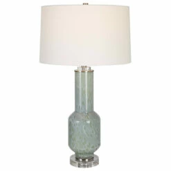 This sophisticated lamp displays a unique bubble glass base in tranquil aqua gray with plated brushed nickel accents and thick crystal details. Tapered hardback shade is covered in a crisp white linen fabric.