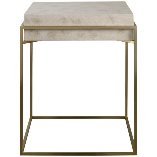 This clean modern accent table showcases an inset ivory burl veneer top supported by a sleek brushed brass plated stainless steel frame.