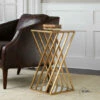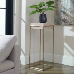 This clean modern plant stand showcases an inset ivory burl veneer top supported by a sleek brushed brass plated stainless steel frame.
