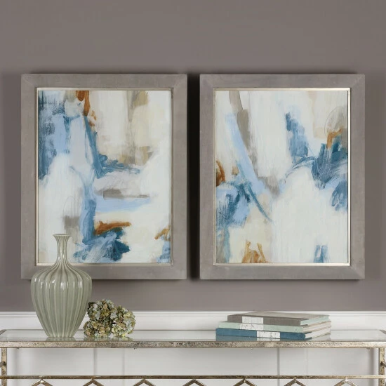Delightful abstract prints feature frames covered in medium grey leather with champagne silver leaf inner lips. Prints are under glass.