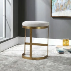 Simplistic but sturdy, this statement counter stool features a thick hand forged iron base finished in a mottled antique gold leaf. Plush seat is tailored in an off-white linen blend fabric.
