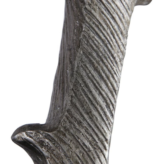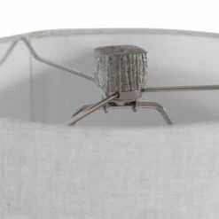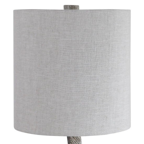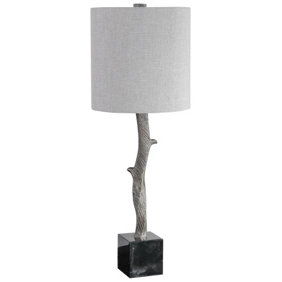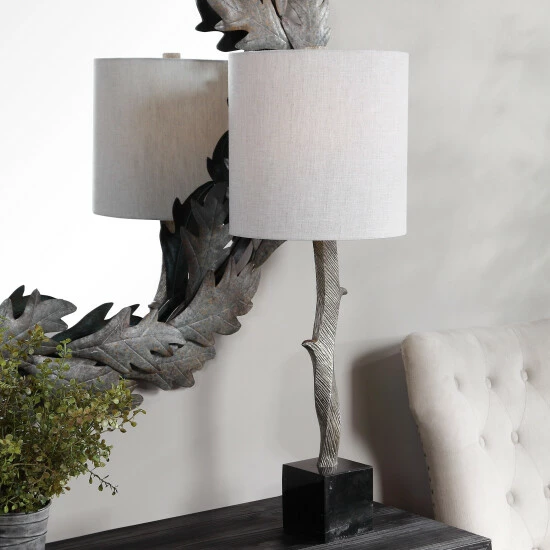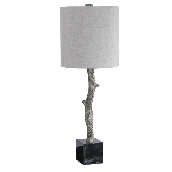 This buffet lamp takes on an abstract branch design featuring heavy texture finished in a lightly antiqued silver, sprouting from a chunky black marble foot. The round hardback shade is a light beige linen fabric.