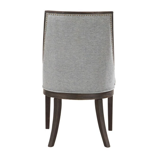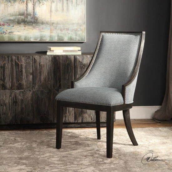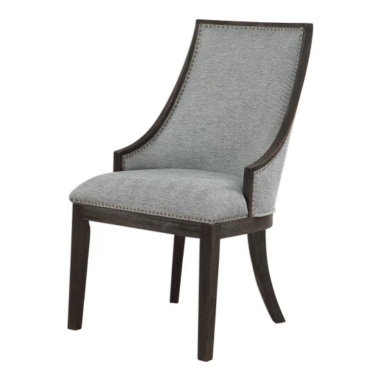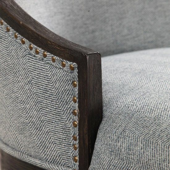 Curved back design in a woven light denim, accented by antique brass nail head trim. Wire brushed birch frame is finished in an ebony stain.