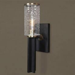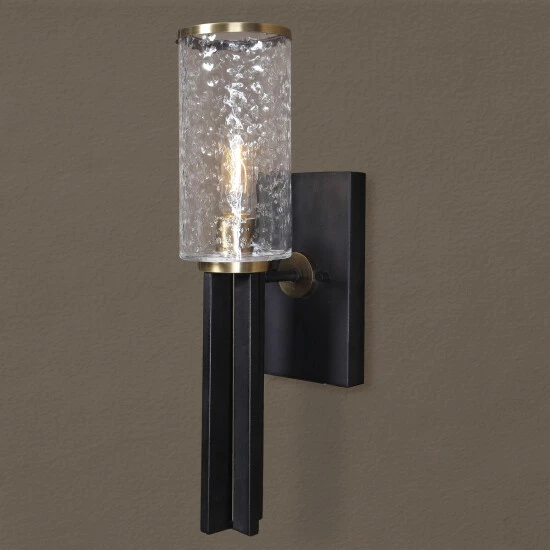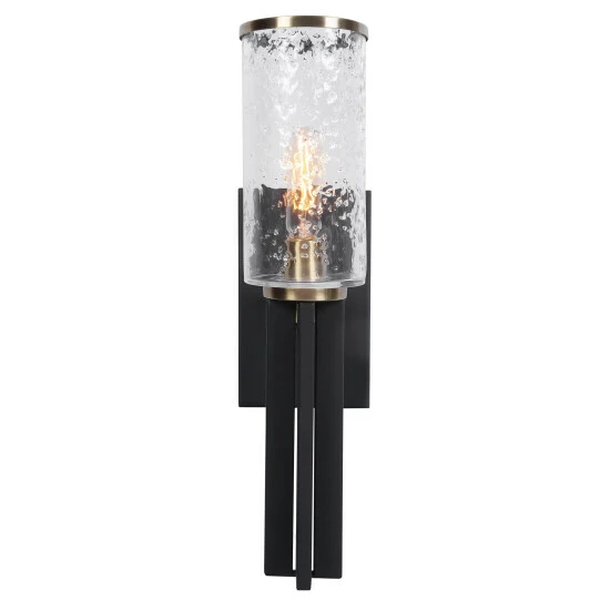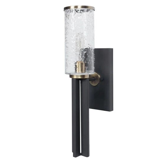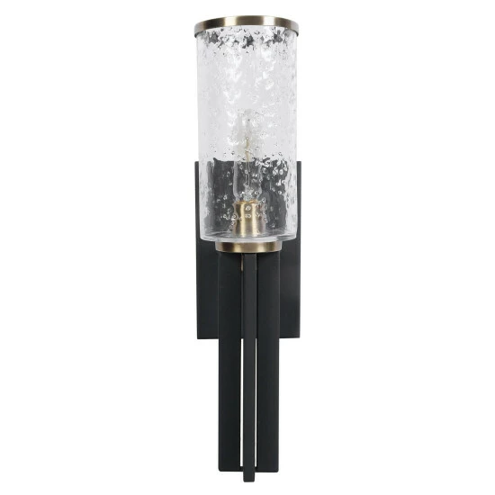 Refined industrial with clean lines on our 1 light sconce features a sanded black finish on the I-beam style frame with refined antique brass accents and clear meteor shower glass shades. With 1-60 watt max Edison socket.