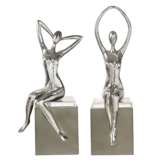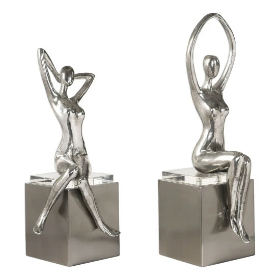 Tarnished silver sculptures with crystal accents and steel cube bases.
