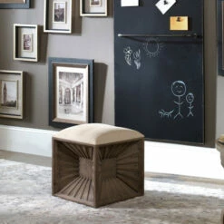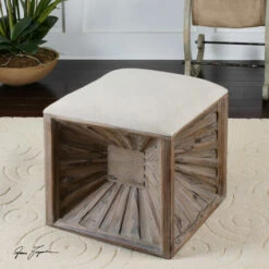 Accent your decor with this unique contemporary cube ottoman. Thesunburst design of the weathered fir wood fills the space withenergy, while the neutral color brings versatility and warmth. Witha natural linen top cushion, this ottoman provides understatedcomfort along with its modern style. Used as an ottoman or a spareseat, this natural wood ottoman provides style and utility for anyroom.
