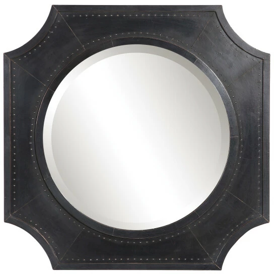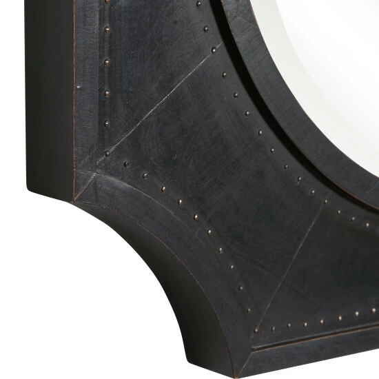 Displaying a rustic lodge style, this mirror is finished in a dark copper cladding with nail accents. The mirror has a 1 inch bevel.