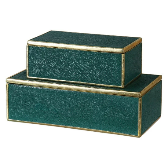 Store treasured keepsakes in this set of two Uttermost Karis boxes. A rich emerald green color with gold leaf accents gives this pair a refined look, while the two different sizes stack neatly for a beautiful display. Included lids keep contents neatly out of sight for a tidy appearance.