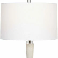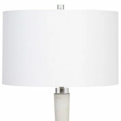 This elegant table lamp is executed in a rich looking material made of granulated white marble that accurately replicates the look of thassos marble, accented by thick crystal details. A white hardback drum shade completes the lamp.