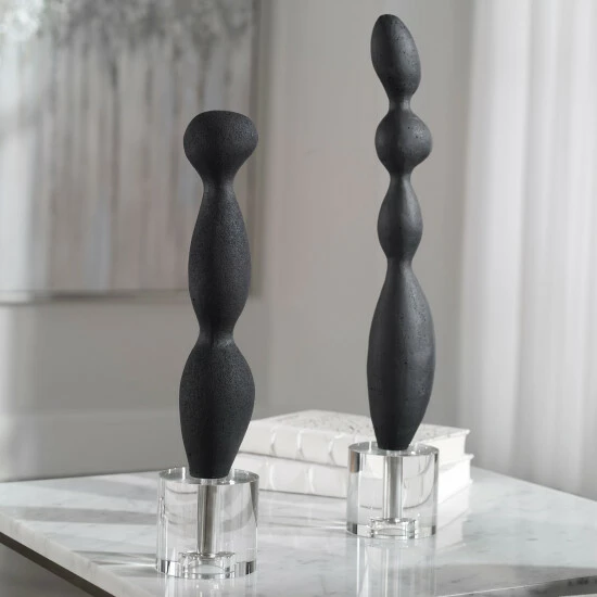 Set of two abstract sculptures made of black granulated marble set atop crystal bases.