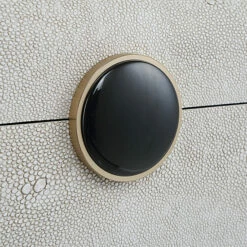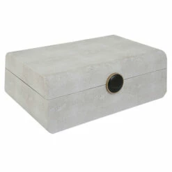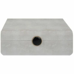 Inspired by the art deco era, this decorative box showcases a faux white shagreen wrapped exterior accented by a brushed antique brass and black enamel closure. The interior is finished in matte black.