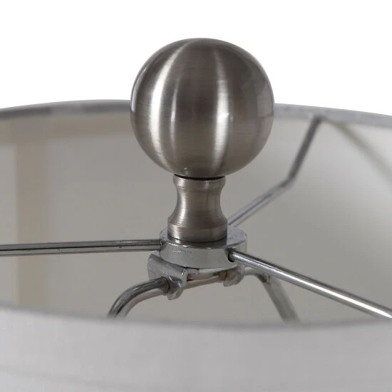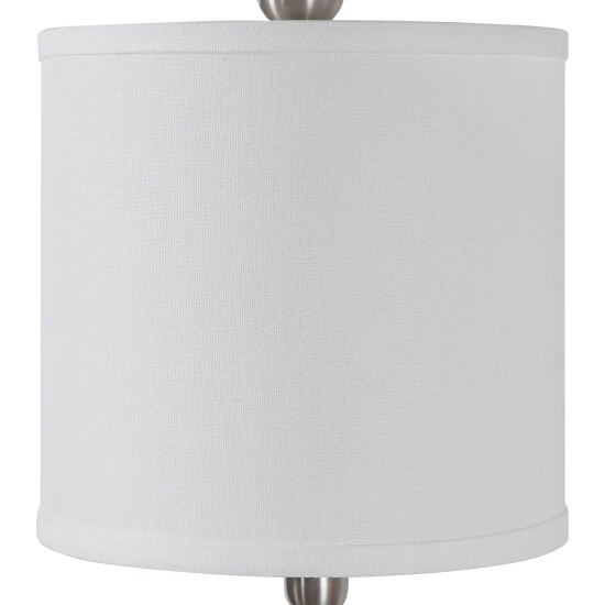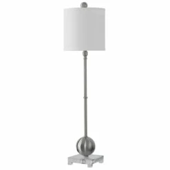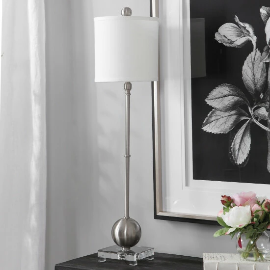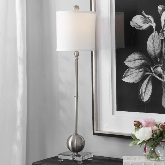 This versatile buffet lamp features smooth iron details finished in a plated brushed nickel, accented with a thick crystal base. The round hardback drum shade is an off-white linen fabric.