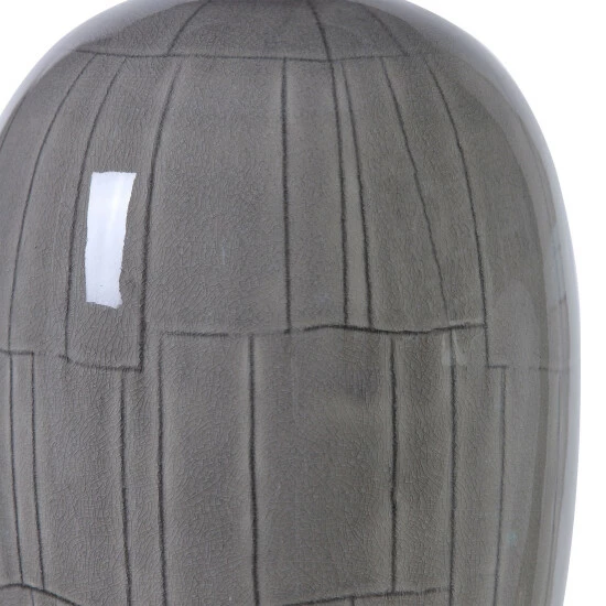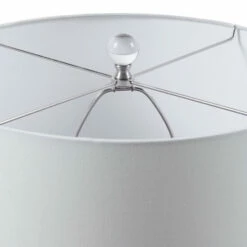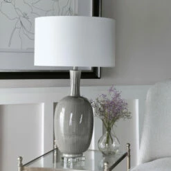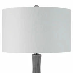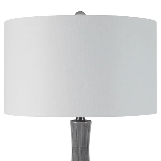 Add a touch of Scandinavian style to a space with this ceramic table lamp. Each piece has a light grey crackle glaze with textured, organic grid line details displayed on a crystal foot with brushed nickel accents. The round hardback drum shade is a white linen fabric.