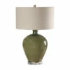 This Lenado table lamp is crafted of heavily frosted, cut sea green glass that is accented with brushed, antiqued brass plated details. The tapered round hardback shade is a gainsborough grey linen fabric with light slubbing.