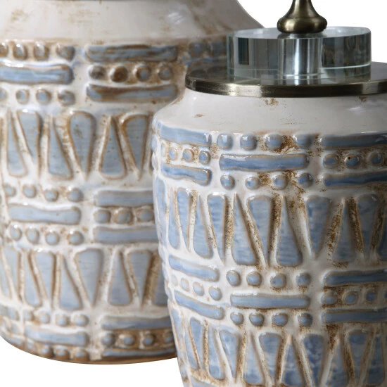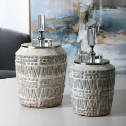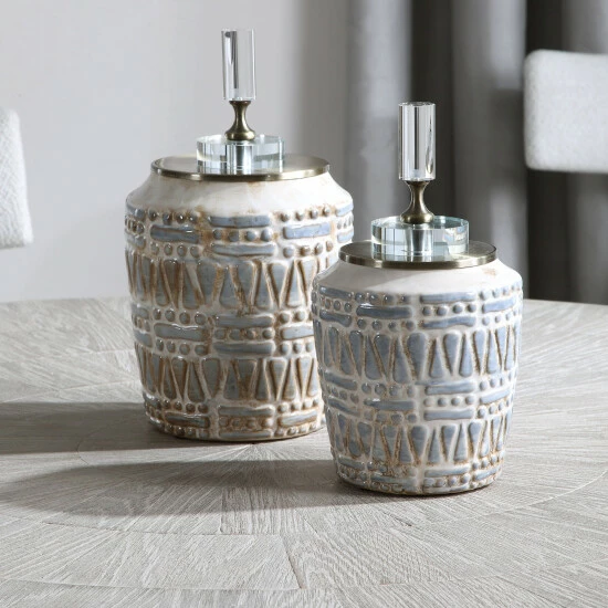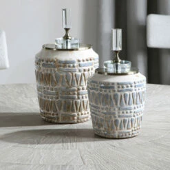 Set of two ceramic bottles showcase a tribal design in a cream, light blue, and taupe colorway. Each features light distressed details and are paired with antique brushed brass and crystal lids.