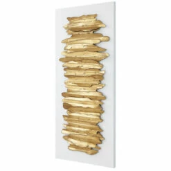 Iron wall art featuring layers of metal strips with crude edging, finished in an antique gold leaf and set on a matte white iron backing. May be hung horizontal or vertical.