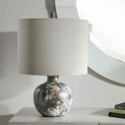 This rustic lamp has a updated appeal featuring a lightly textured ceramic base finished in a mottled white covered in an aged chocolate bronze and brown, accented with antique brass plated details. The round hardback drum shade is light beige linen fabric.