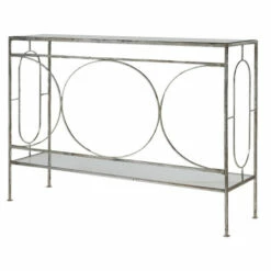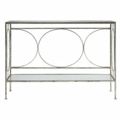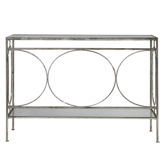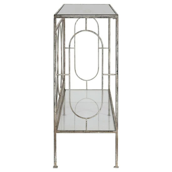 This Luano console table features a refined look through its thinly shaped forged iron crafting. It is completed with its heavily distressed antique silver finish. The top shelf is mirrored with a clear tempered glass gallery shelf.