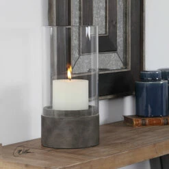 This hurricane candleholder features an antiqued concrete base with clear glass globe and 5-inch x 4-inch distressed off-white candle. Suitable for both indoor and outdoor use.