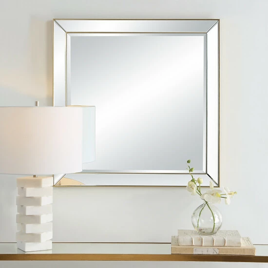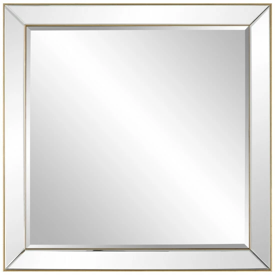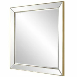The perfect accent to any style, this square mirror has a slim gold outer and inner edge, encasing a raised beveled mirror frame. Mirror has a 1/2″ bevel.