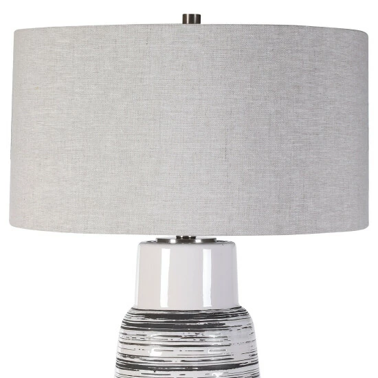 This table lamp features a tall ceramic base finished in a heavily distressed aged ivory glaze with dark rust black undertones. A thick crystal foot and brushed nickel plated accents highlight the piece. The round hardback shade is a light oatmeal linen fabric with natural slubbing.