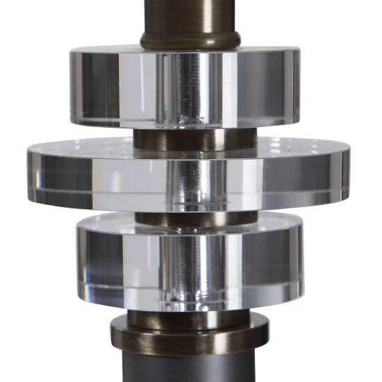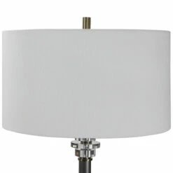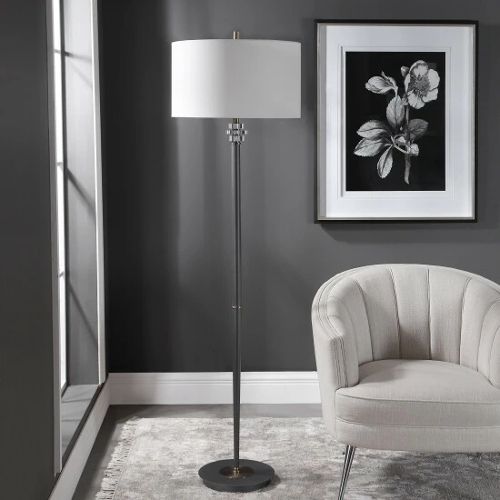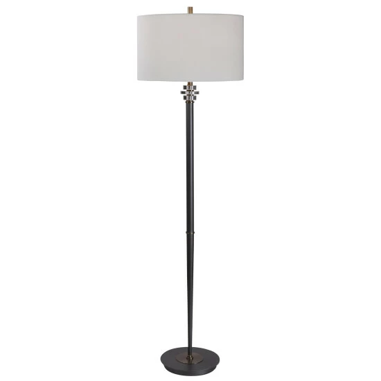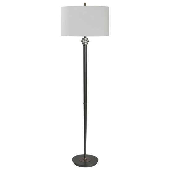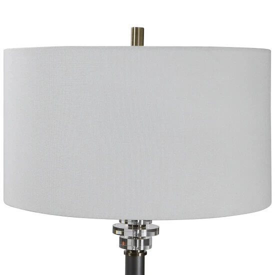 Transitional in design, this floor lamp features a sleek steel base finished in a dark bronze, accented with antique brass plated details and crystal ornaments. The round hardback shade is a white linen fabric.
