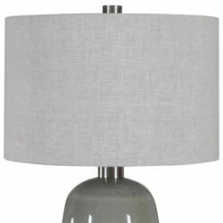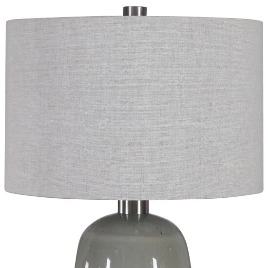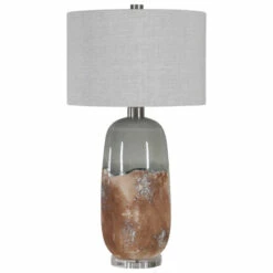 This table lamp features a ceramic base finished in an earthy terracotta rust that transitions into a crackled green grey glaze, accented with brushed nickel plated details and a thick crystal foot. The hardback drum shade is a warm grey linen fabric with with natural slubbing.
