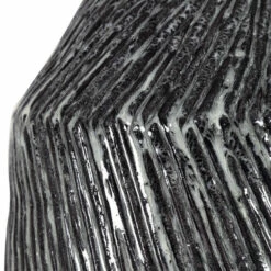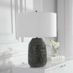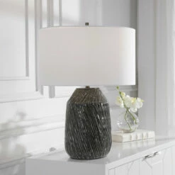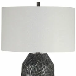 Displaying a modern, on-trend look this ceramic table lamp features a hand carved texture finished in a graphic black and white color palette with brushed nickel plated details. A white linen fabric drum shade compliments the piece.