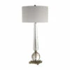 A mottled dark bronze finished geometric frame sits atop a matte black foot to style this intriguing. The strikingly modern rectangle bell shade completes the look with its ivory linen fabric construction.