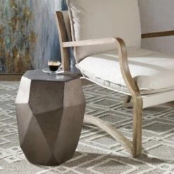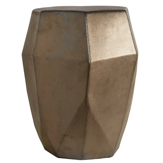 Handcrafted from ceramic, this garden stool showcases a multi-faceted geometric construction finished in an aged golden bronze with distressed detailing. Perfect as a drink table or artistic accent to complement your favorite chair. May be used outdoors, but protection from freezing temperatures is recommended.
