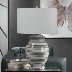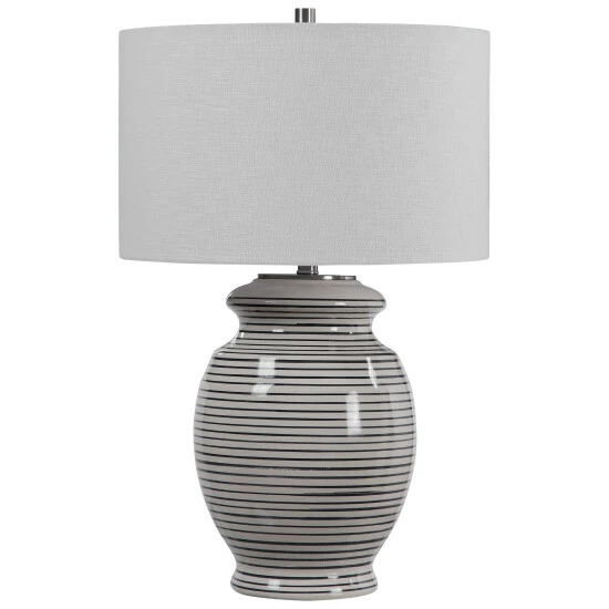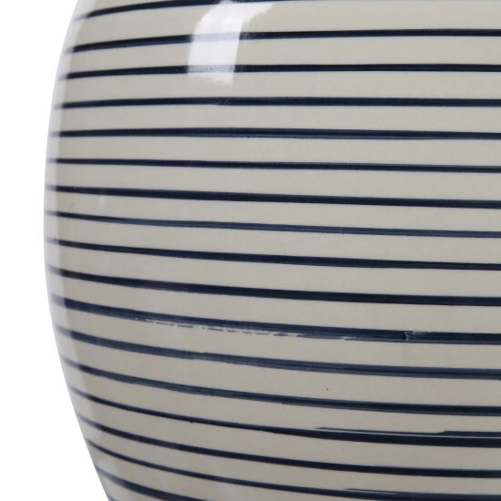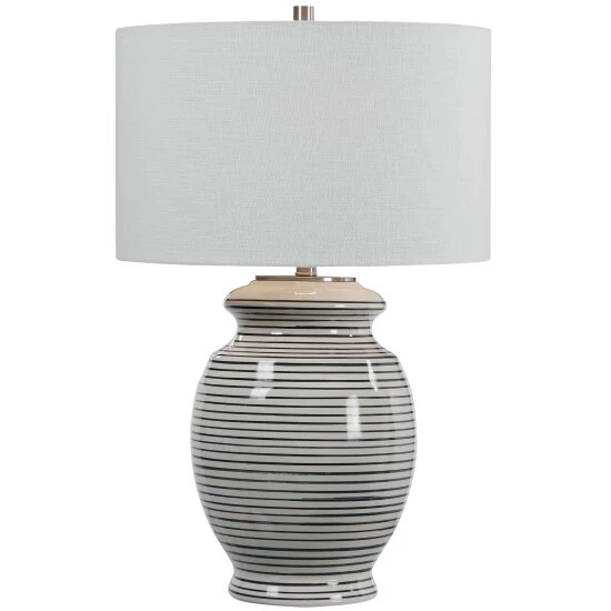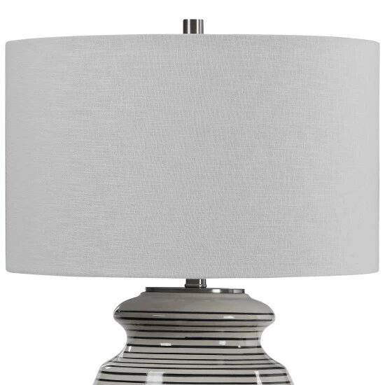This table lamp has a ceramic base finished in an off-white glaze with navy blue stripes, accented with brushed nickel details. The lamp has a white linen drum shade with natural slubbing.