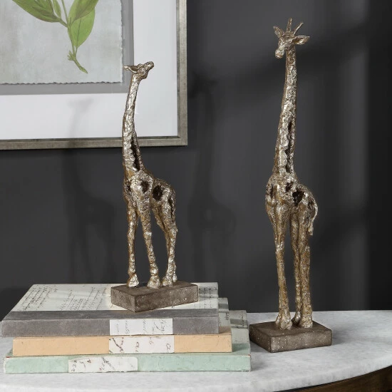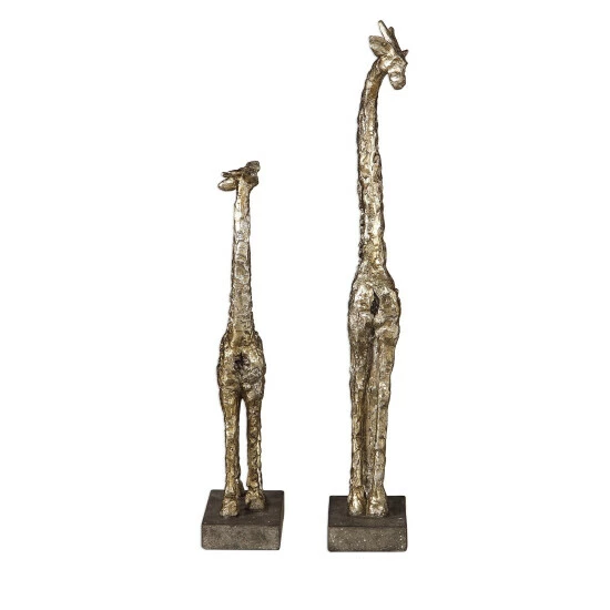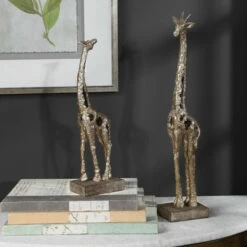 Set of two giraffe figurines feature a molded clay texture with an antique plated metallic silver finish and set atop lightly antiqued concrete bases.