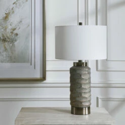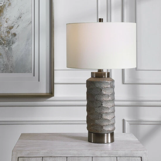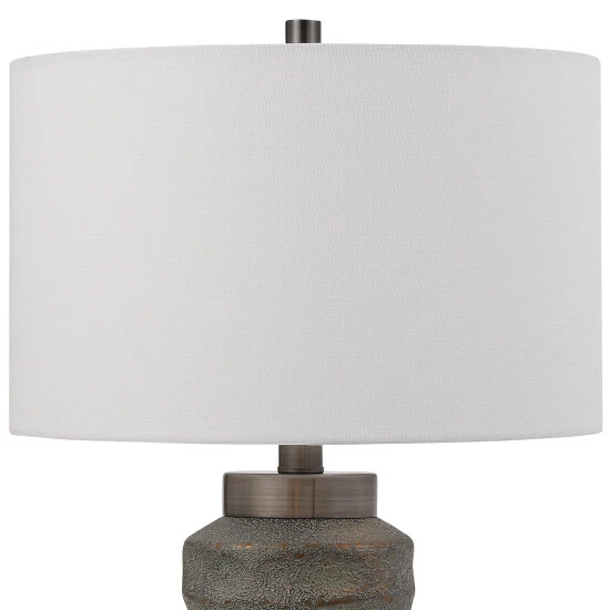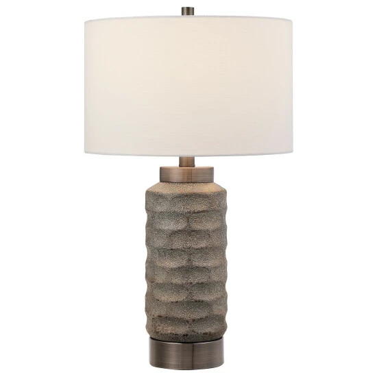 Showcasing a uniquely carved base, this ceramic table lamp features a metallic dark bronze finish with a concrete like texture, accented with black nickel plated details. A white fabric drum shade completes the look.