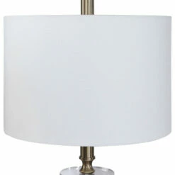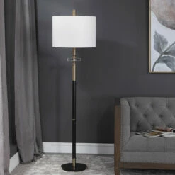 Traditional elegance is showcased in this floor lamp, finished in an aged black with antique brass plated accents and a thick crystal ornament. The round hardback drum shade is a white linen fabric.