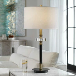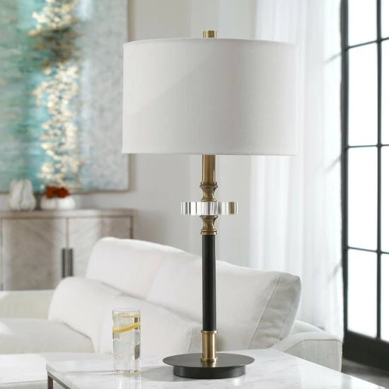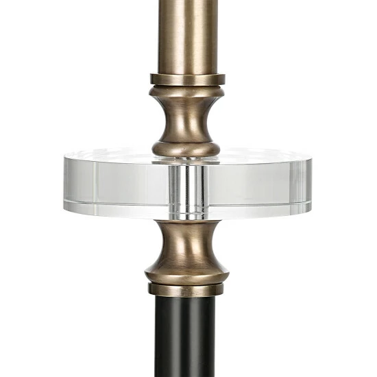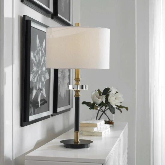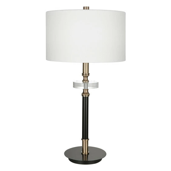 Traditional elegance is showcased in this table lamp, finished in an aged black with antique brass plated accents and a thick crystal ornament. The round hardback drum shade is a white linen fabric.