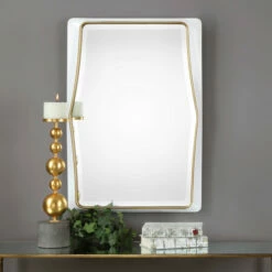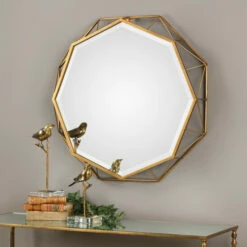 Discover three-dimensional design with the Mekhi mirror. Hand-forged from iron with an antiqued gold leaf finish, this sturdy octagonal mirror pops out of the wall and makes a modern statement.