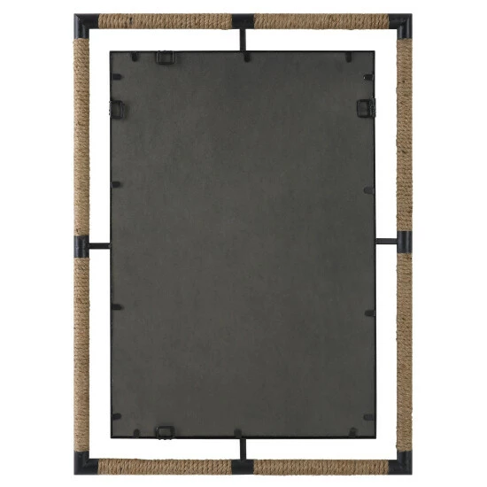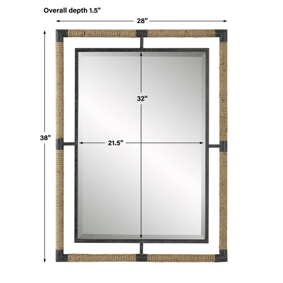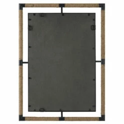This forged iron mirror frame is finished in a textured rust black that is wrapped in natural rope bringing a coastal feel to any room. The mirror is surrounded by a generous 1 1/4″ bevel. May be hung horizontal or vertical.