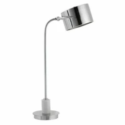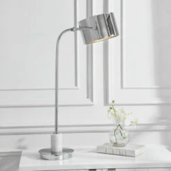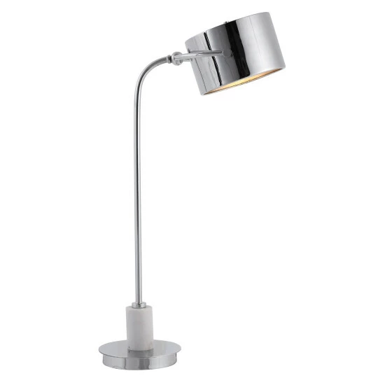 Contemporary desk lamp features a solid steel construction that’s finished in a sleek polished nickel plating with a matching metal shade, accented with a white marble collar.