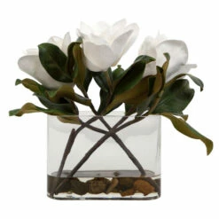 A trio of white magnolia blooms are placed in a clear glass vase with faux water and natural river stones.