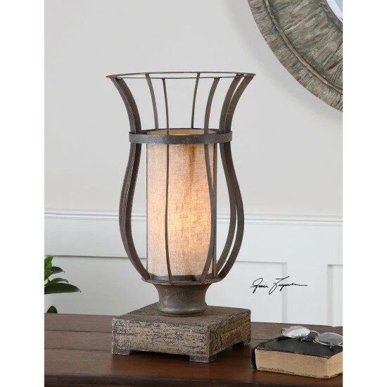 With a classic rustic style, this table lamp will bring elegance to your home. The rusted bronze metal cage and distressed wood base sit together to make this lamp a classic piece. With a 40 watt bulb, this lamp offers just the right light and size to fit seamlessly in any space.