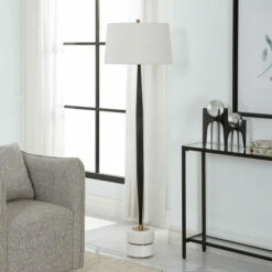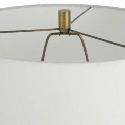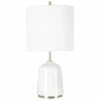 The miraz lamp oozes sophistication with its channeled cast iron base, brushed brass accents, and a considerable white marble foot. The tapered hardback shade is covered in a white cotton fabric.