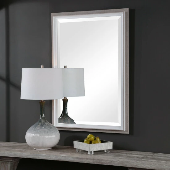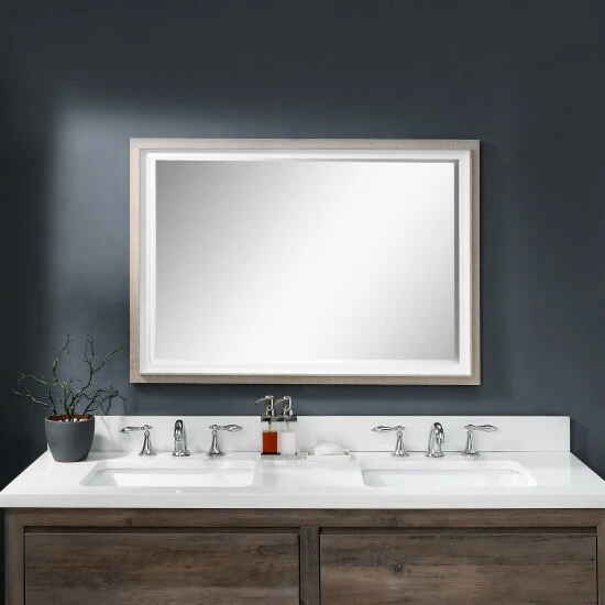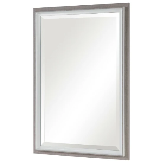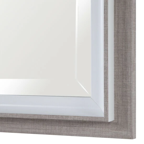 This vanity mirror showcases a dimensional light linen look in an oatmeal finish paired with gloss white details. The piece has a 1 1/4 inches bevel and may be hung horizontal or vertical.