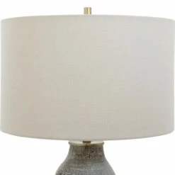 Exhibiting a handcrafted look, this ceramic table lamp features a textured finish reminiscent of woven fabric and is finished in various shades of neutral greys and taupe with rust brown accents and antique brushed brass hardware. The piece is completed by an off-white hardback drum shade with natural slubbing.