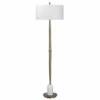 Sleek lines and an industrial style make this Uttermost Mondovi lamp a welcome addition to any home. This floor lamp features a hand-forged metal tripod base with an antique-style brushed-bronze finish for an elegant appeal. The coordinating round white linen shade provides sophisticated contrast and helps the piece easily complement your existing decor.