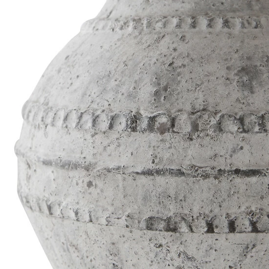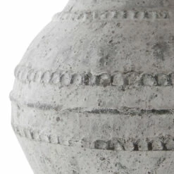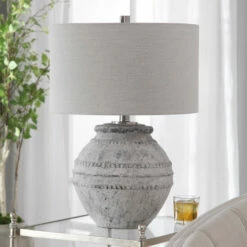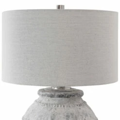 Showcasing an old world style, this ceramic table lamp has a heavily distressed stone ivory finish and aged grey undertones, accented with brushed nickel plated details. The hardback drum shade is an off-white linen fabric.