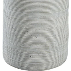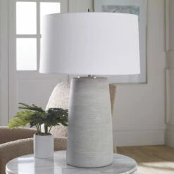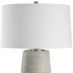Handcrafted in an artisanal style, this table lamp is formed from ceramic in neutral off-white and gray tones with carved ring detailing. Steel accents are finished in a complementary brushed nickel. The hardback drum shade is covered in a white linen fabric.