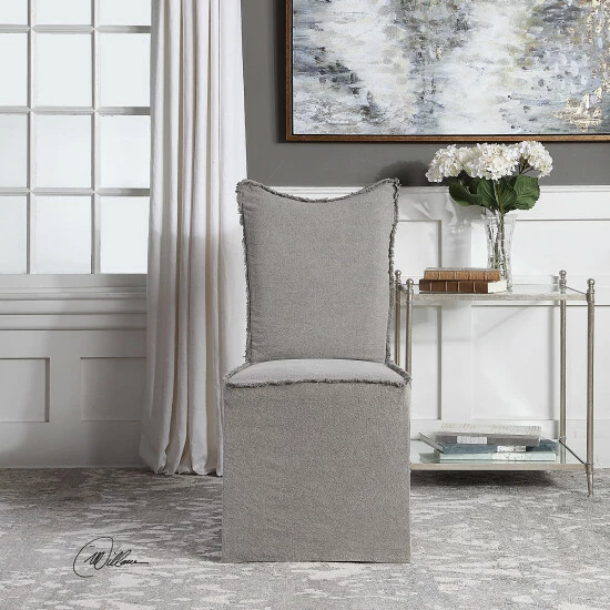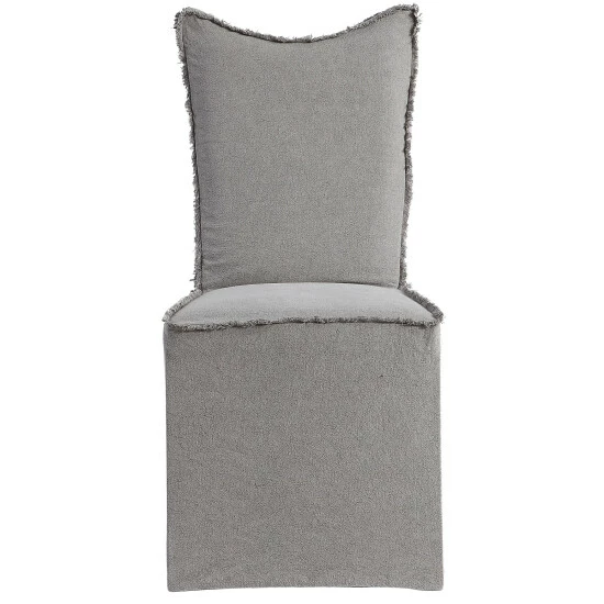 Stonewashed grey linen blend slipcover features a reverse seam with fringe, draped over an armless frame with naturally finished poplar legs, body fabric is a neutral linen. Slipcovers packaged separately. Sold as a set of 2.